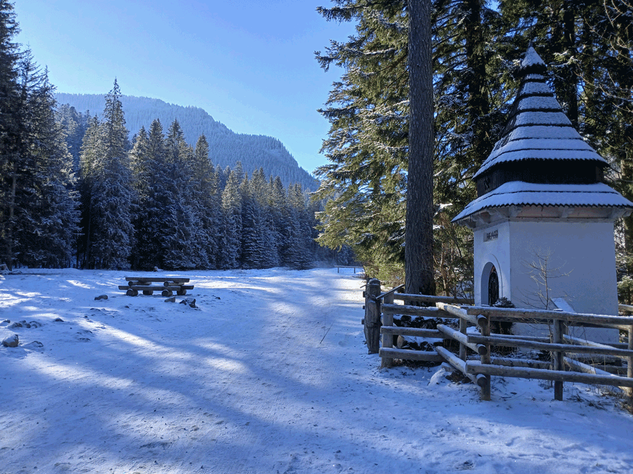 Dotarliśmy do pierwszego rozwidlenia szlaków – nie skręcamy, lecz trzymamy się zielonego oznakowania. Po prawej stronie mijamy Kapliczkę Zbójnicką św. Barbary. Niegdyś w dolinie, która stanowiła ośrodek górniczy i hutniczy, funkcjonowała huta żelaza, a na zboczach Ornaku.
